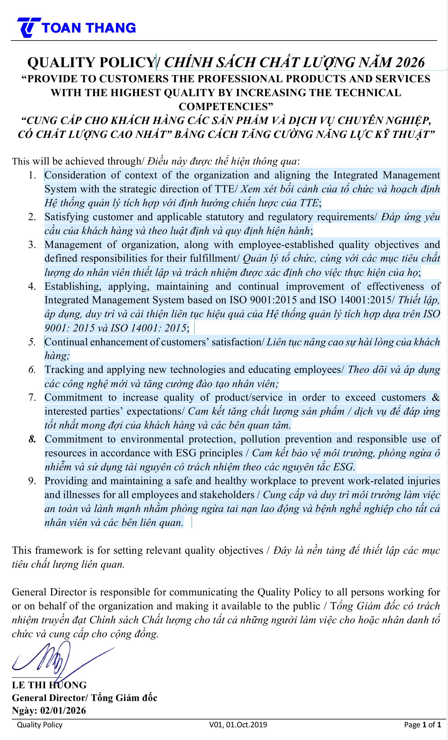 TTE Công Bố Chính Sách Chất Lượng 2026: Nâng Tầm Năng Lực Kỹ Thuật & Phát Triển Bền Vững